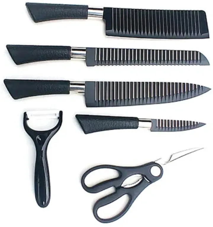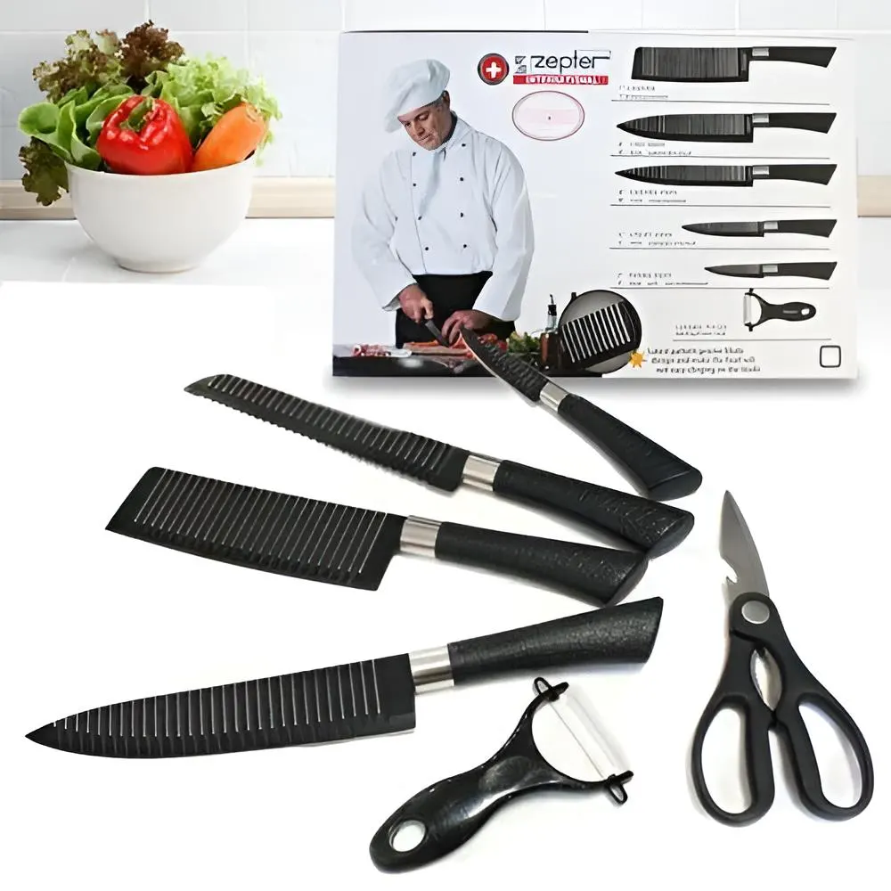 Includes: Chef Knife, Bread Knife, Small Knife, Peeling Knife, scissors and ceramic peeler